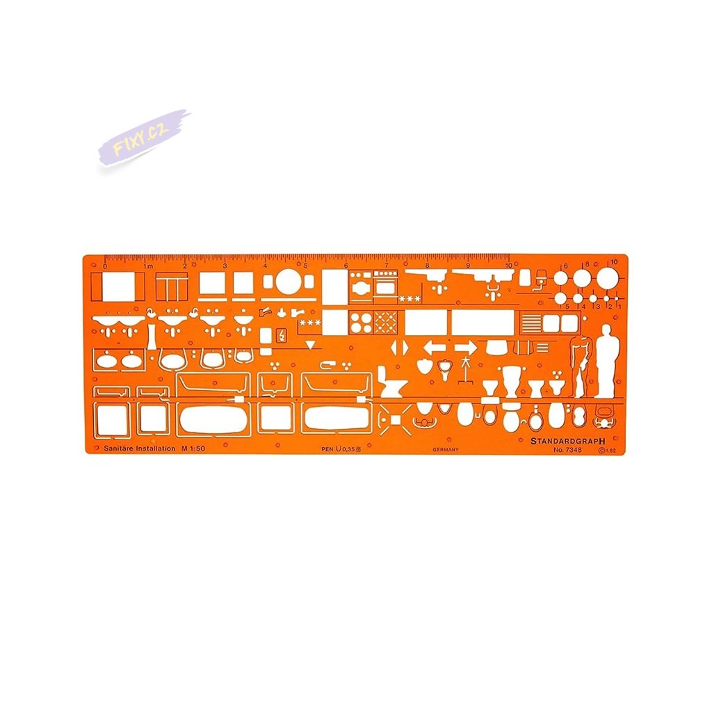 Šablona Graph'It z ohebného a průhledného plastu pro snadné kreslení sanitárních prvků. Šablona obsahuje 104 tvarů v měřítku 1:50.