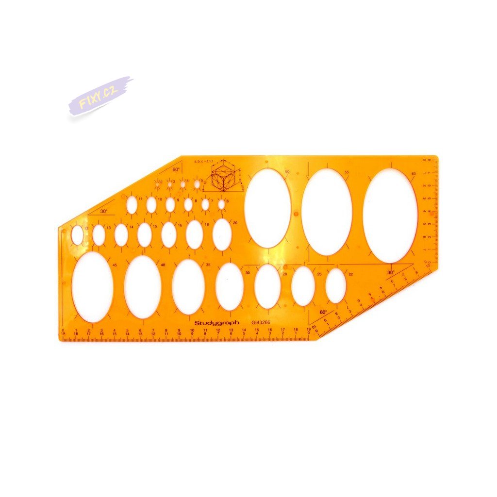 Šablona Graph'It z ohebného a průhledného plastu pro snadné kreslení isometrických elips. Šablona obsahuje 27 elips o rozměrech 2-60mm a úhlech 30° a 60°. Pravítko na okrajích v cm.