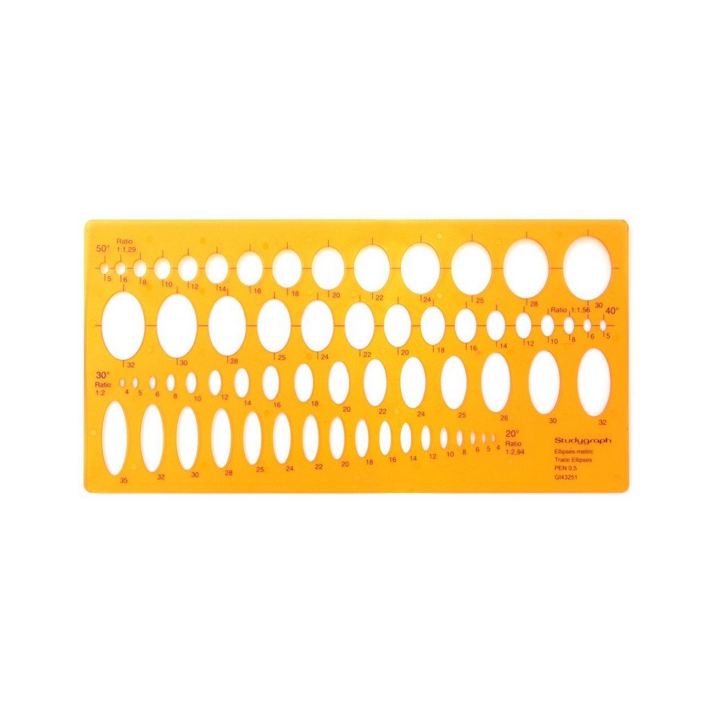 Šablona Graph'It z ohebného a průhledného plastu pro snadné kreslení elips. Šablona obsahuje 62 kružnic o velikosti 4-35mm a ve 4 úhlech: 20°, 30°, 40° a 50°.