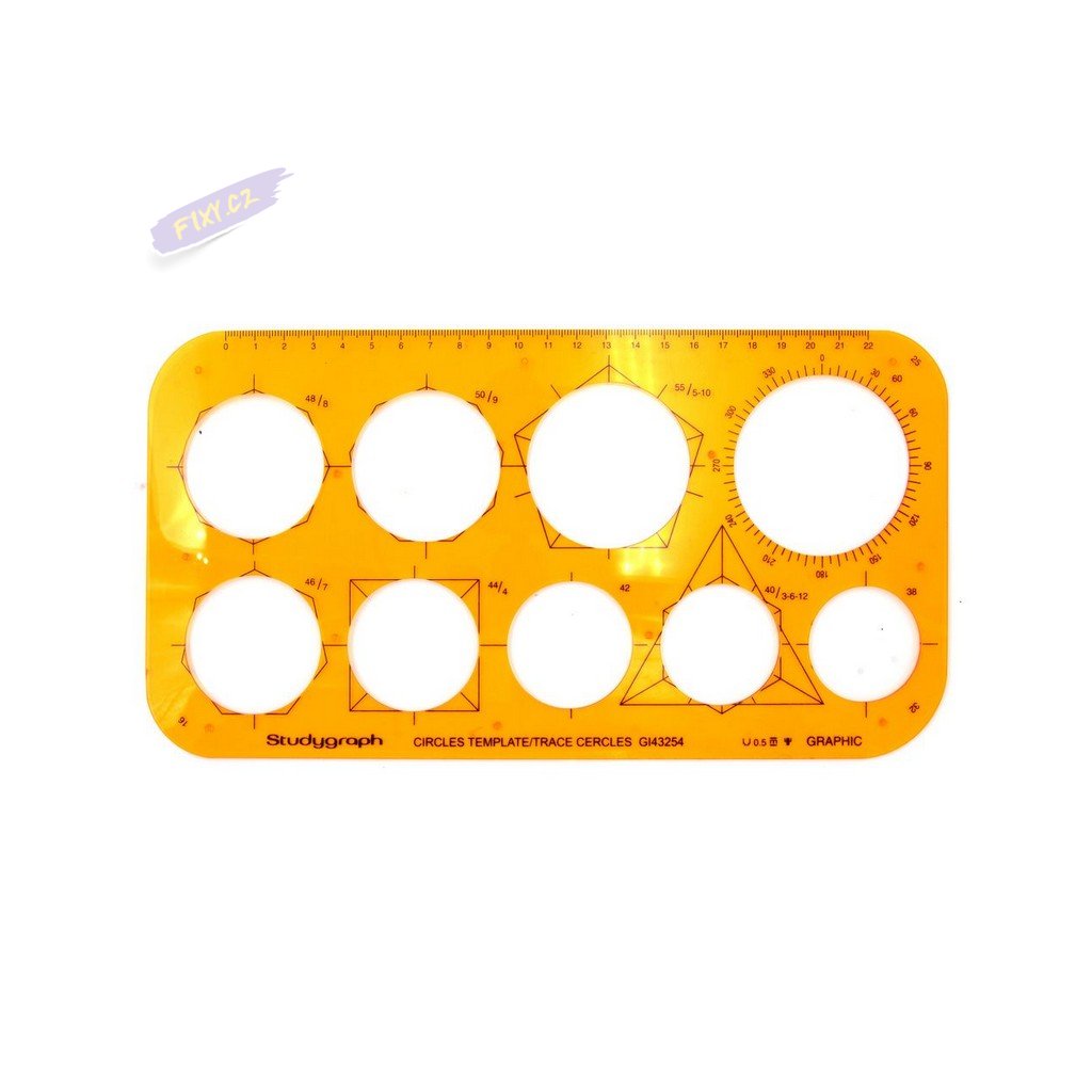 Šablona Graph'It z ohebného a průhledného plastu pro snadné kreslení kružnic. Šablona obsahuje 9 kružnic o velikosti 38-60mm. Pravítko na okrajích v cm.
