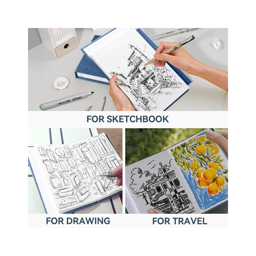 Skicář ARRTX pro univerzální použití s akvarelovými, akrylovými nebo lihovými barvami. Bílý papír s gramáží 180g/m2 zvládne a vydrží vše.