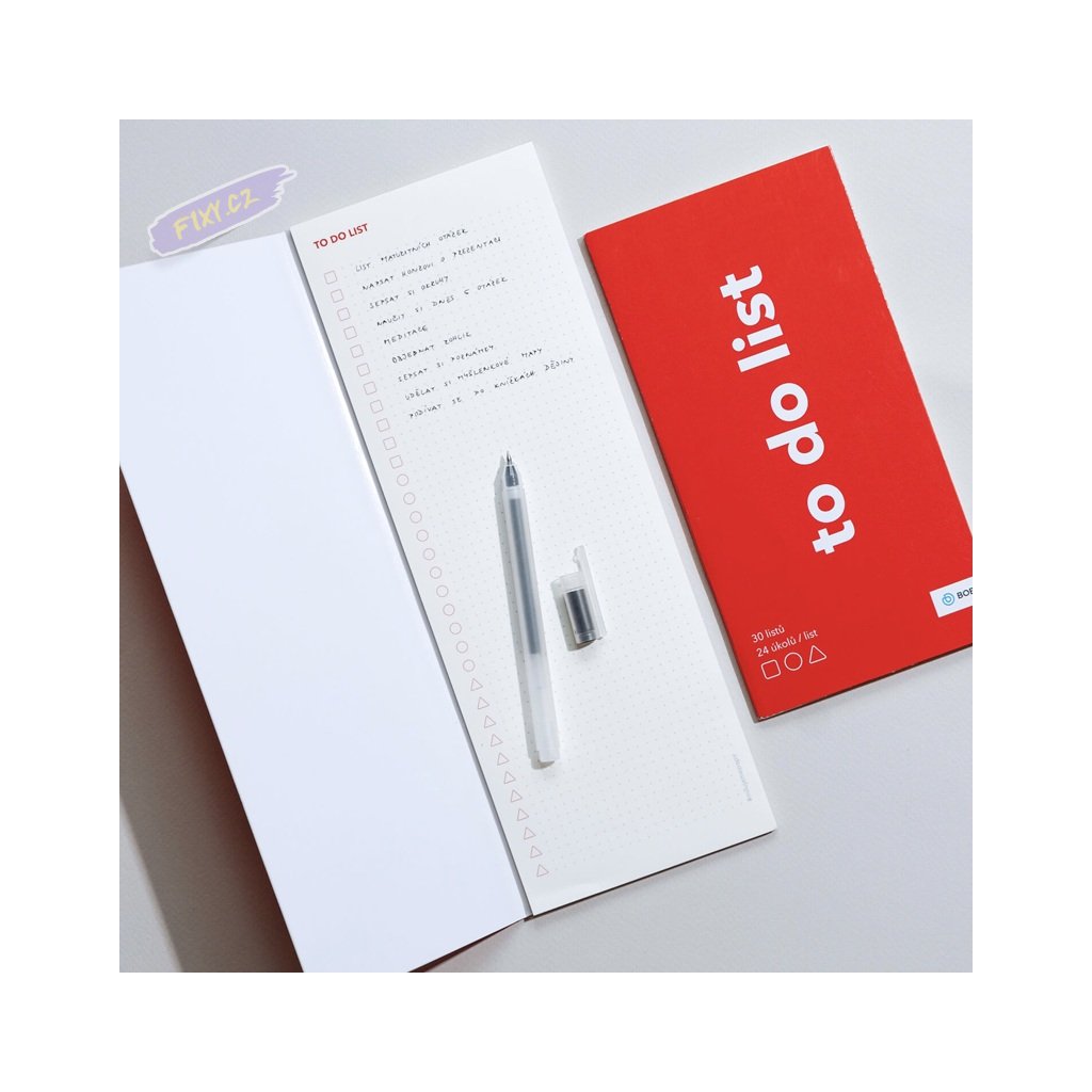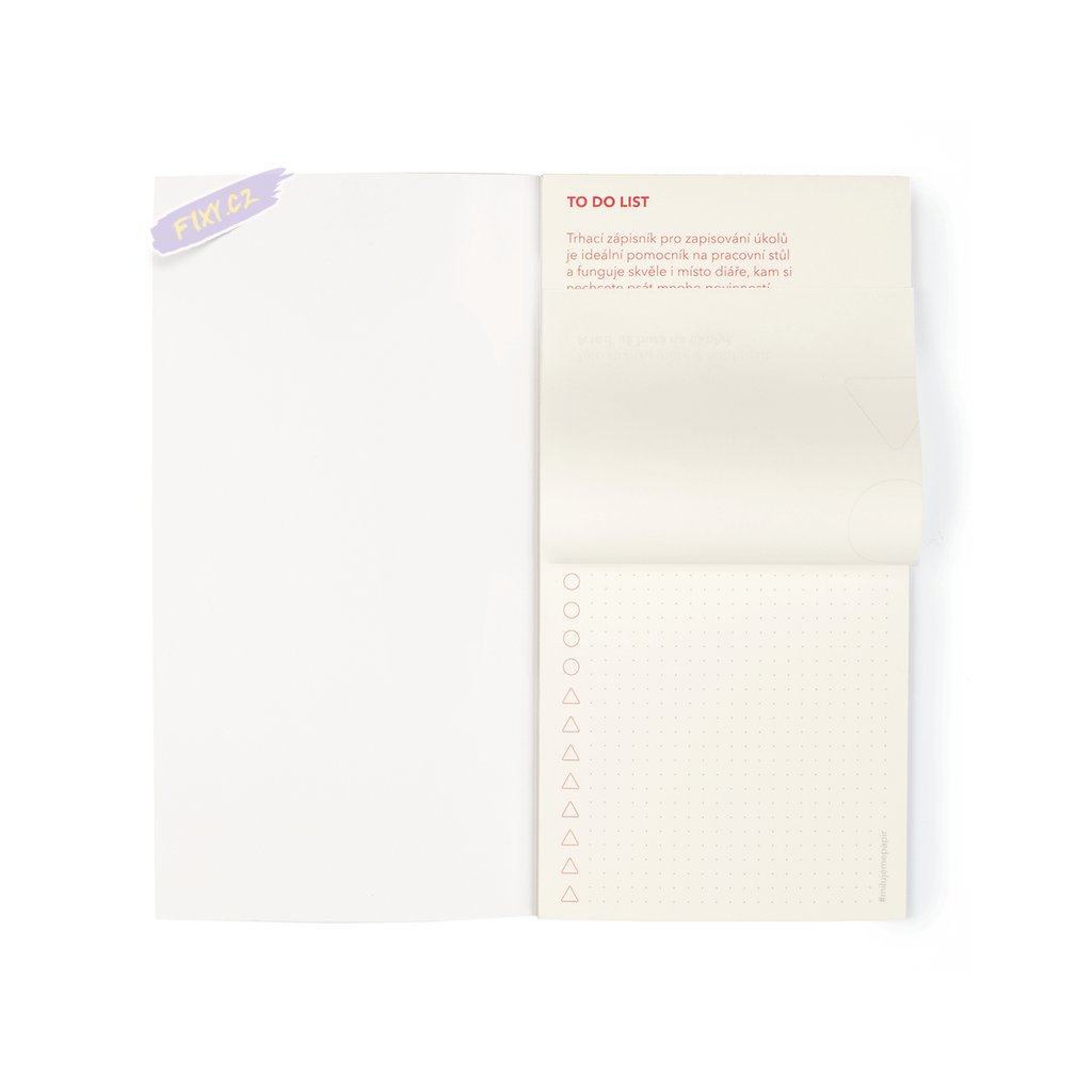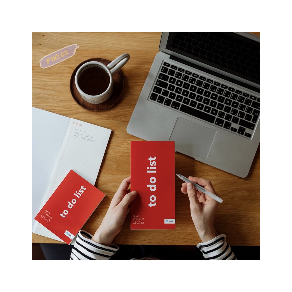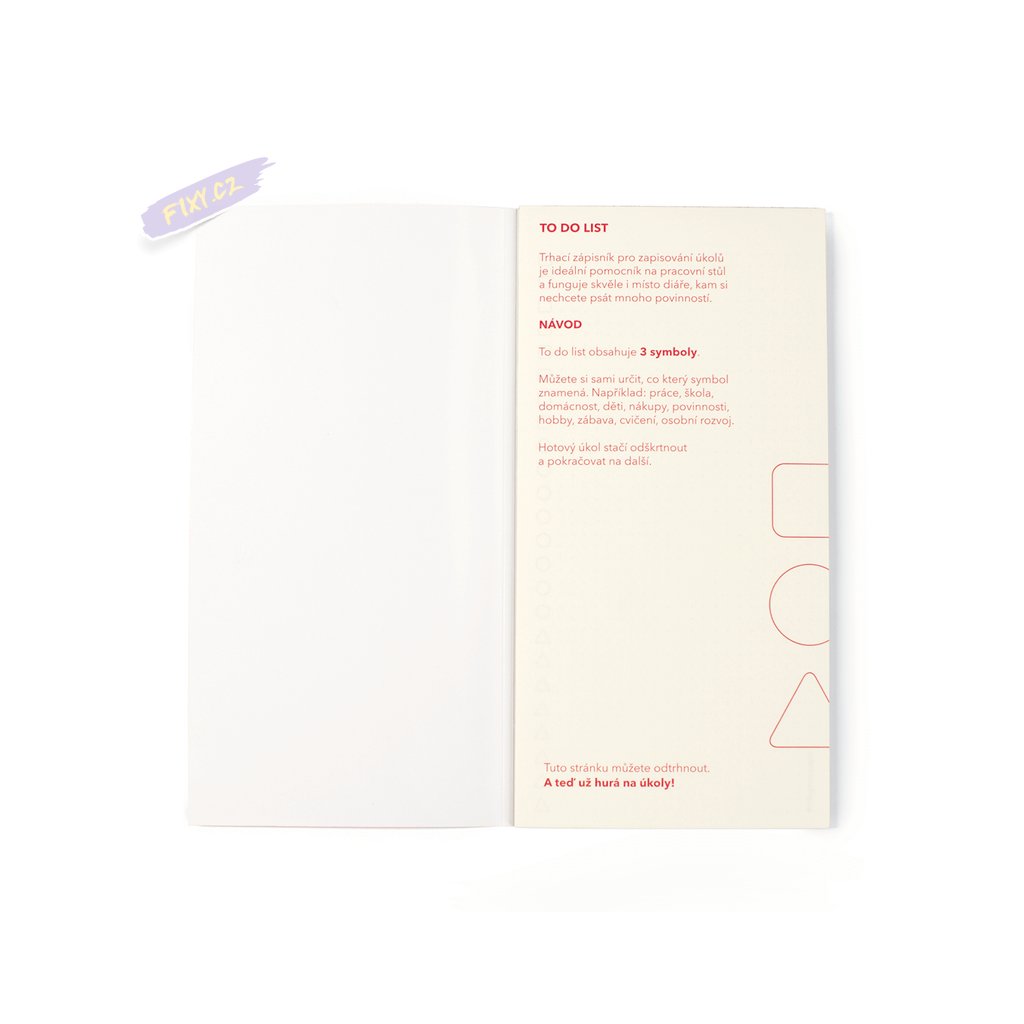 Velké úkoly je někdy lepší rozepsat do několika menších povinností. Bude se vám totiž lépe pracovat a odškrtnuté úkoly vás budou motivovat dál. Díky lepené vazbě můžete papír vytrhnout a mít jej stále u sebe. To do list obsahuje tři různé symboly. Pokud potřebujete své povinnosti nějak odlišit, rozdělte úkoly podle nich. Každý symbol může vyjadřovat něco jiného - například: práce, škola, domácnost, děti, nákupy, povinnosti, hobby, zábava, cvičení nebo osobní rozvoj.