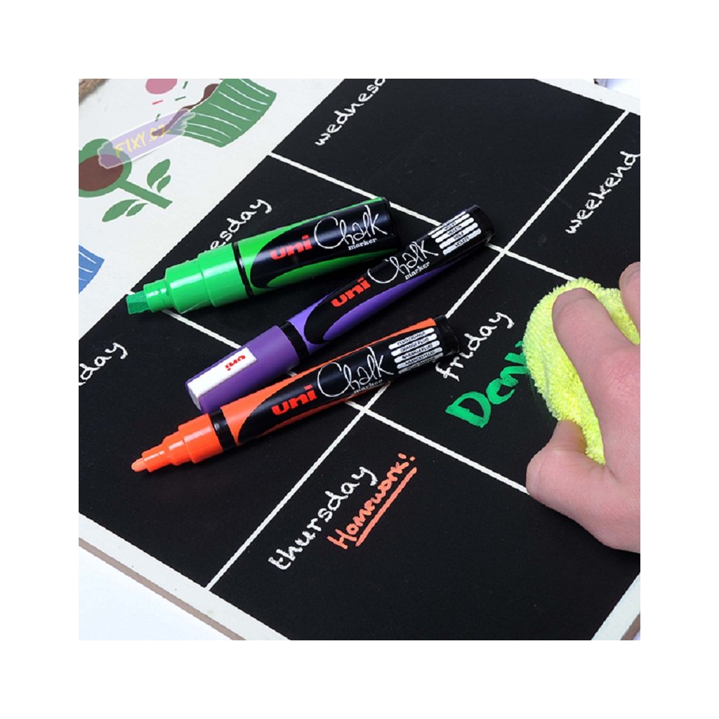 Křídový popisovač UNI CHALK je určen na popis výloh, tabulí, oken, zrcadel, kovových a plastových povrchů s možností okamžité opravy. Na čistém neporezním a odmaštěném povrchu odolává po zaschnutí vodě i UV záření, a následně je křídová stopa stíratelná vlhkou utěrkou. Inovativní křídový popisovač pro použití v průmyslu, tvoření, výrobě dekoraci a na informační tabule.