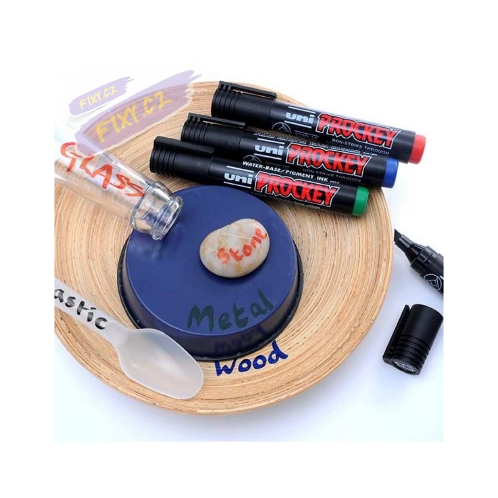 Permanentní popisovač UNI PROCKEY je nejrychlejším a nejúčinnějším způsobem pro trvalé značení předmětů a potřeb. Píše na většinu povrchů včetně papíru, dřeva, kovu, skla, plastu, tkaniny a kamene. Inkoust je světlostálý a voděodolný, takže štítky nevyblednout a nesmyjí se, což z něj dělá nezbytnou pomůcku pro domácnost, kancelář nebo školu. Nedochází k prosáknutí psaného textu. Fix obsahuje pigmentový inkoust na bázi vody bez zápachu. Tento spolehlivý popisovač pro trvalé značení je také vynikající pro grafické použití.