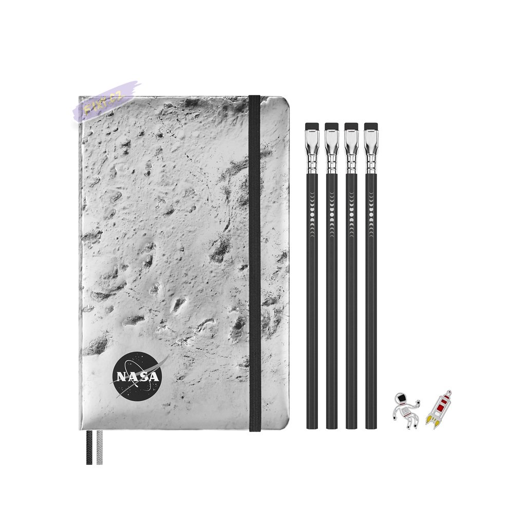 Sada Moleskine NASA obsahuje zápisník velikosti L, grafitové tužky Blackwing a 2 ozdoby na zápisník. Tato kolekce, inspirovaná lunárním povrchem, oslavuje návrat lidstva k misím na Měsíc a přináší prostor k objevování fantazie i vyjádření nekonečných možností tvůrčí inspirace.