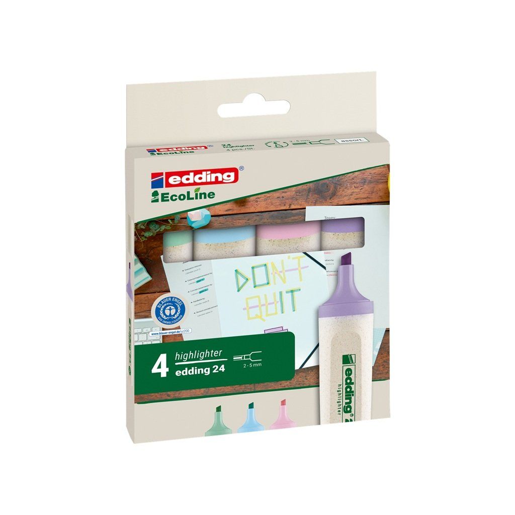 Znovu naplnitelný zvýrazňovač EDDING z ekologické řady edding EcoLine. První a dosud jediný zvýrazňovač certifikovaný uznávanou ekologickou značkou Blue Angel. Víčko a tělo zvýrazňovače je vyrobeno z více než 90% z obnovitelných zdrojů, jakým je cukrová třtina. Vlákna tamponu jsou vyrobena z recyklovaných materiálů. Zvýrazňovač je navíc znovu naplnitelný (inkoust edding HTK 25), čímž je možné snižovat množství vyprodukovaného odpadu. Inkoust na bázi vody s pastelovými barvami.