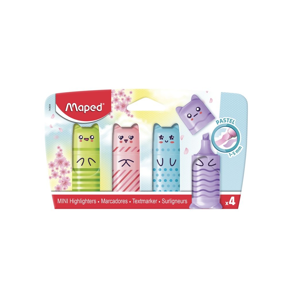 Plochý mini zvýrazňovač Maped Pastel Mini v patelových barvách s designem japonských kawai kočiček. Víčko a tělo v barvě inkoustu. Kvalitní a jasný fluorescenční inkoust. Ideální velikost pro školní penál.
